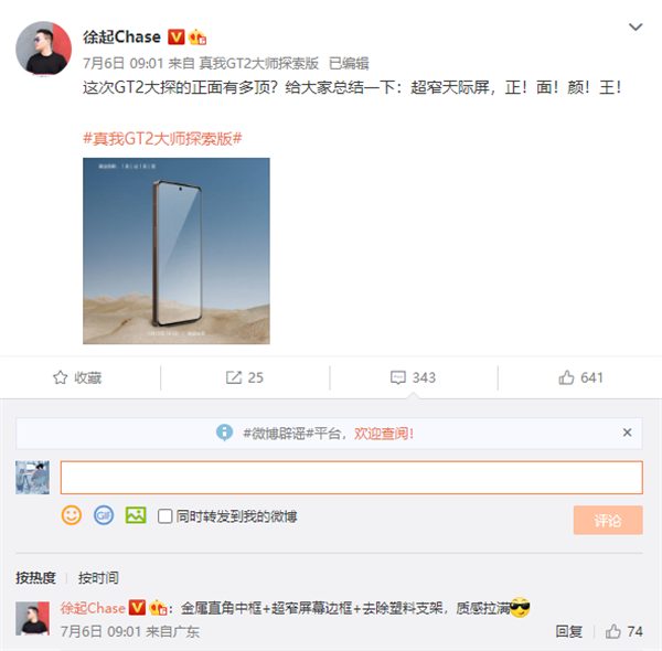 值得一提的是,realme副总裁徐起表示,GT2大师探索版采用超窄天际屏,号称“正面颜王”。新机采用直角中框+超窄屏幕边框+去除塑料支架设计,质感拉满。