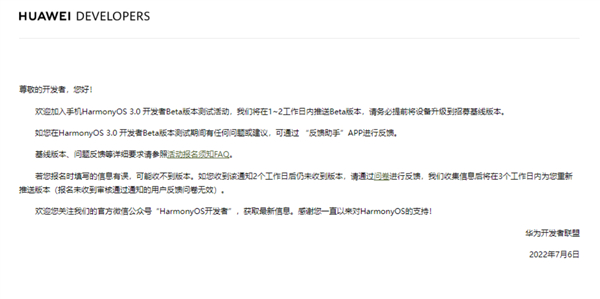从华为开发者联盟发布的通知来看,鸿蒙3.0开发者Beta版本将在1-2个月内推送,务必提前将设备升级到招募基线版本。