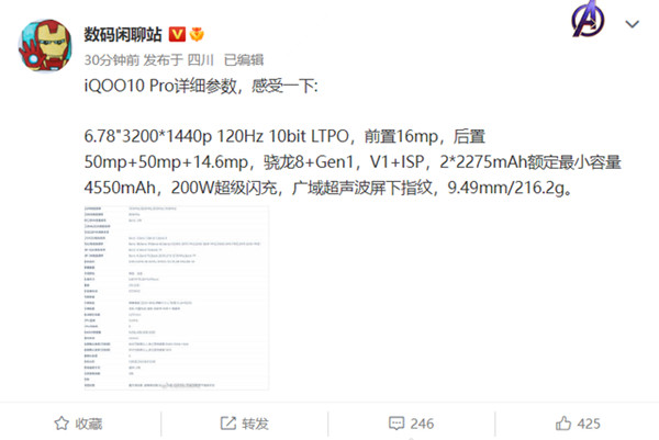 据数码博主 @数码闲聊站 此前爆料,iQOO 10 Pro 将首发 10 电芯 200W 超级闪充,厚 9.49 毫米,重 216.2 克,采用 6.78 英寸 2K 120Hz AMOLED 屏,支持 10bit 色深、LTPO 自适应刷新与广域超声波屏下指纹。