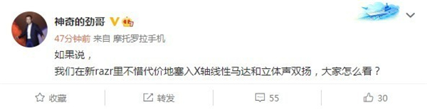 7月6日早上,联想中国区手机业务部总经理陈劲(@神奇的劲哥)在微博上透露了摩托罗拉Razr 3折叠屏新机的最新消息,他暗示称,Razr 3折叠屏会不惜代价地塞入X轴线性马达和立体声双扬声器,给用户带来更加沉浸的游戏和观影体验。