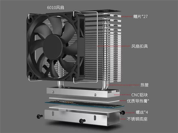 随着采用 PCIe 4.0 总线的高性能 M.2 SSD 的普及,许多发烧友也遇到了过热节流的问题。而九鲨新推出的 M.2 2280 散热器,就采用了夸张的塔式热管 + 主动式风扇的设计。此前这种方案多见于 CPU 散热器,但九鲨 M.2-Three 也用一条 10mm 镀镍铜热管穿过了 27 个铝制鳍片,底座则是 CNC 加工铝基板。
