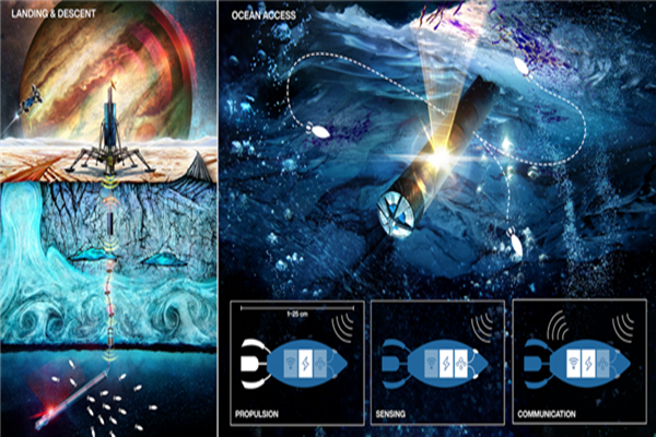 为了进入这些水生环境,美国宇航局正在开发和完善许多海洋进入任务概念,包括欧罗巴科学探索地下进入机制 (SESAME) 类热机械钻井机器人,以及更小的独立微型游泳机器人(SWIM)。