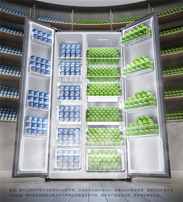 这款526L大冰箱采用对开门设计,分为347L冷藏空间和189L冷冻空间,共20格存储空间,官方称可装下309盒冰淇淋487个苹果。