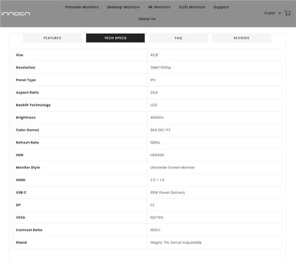 最后,INNOCN 44C1G 超宽电脑显示器的售价为 709 美元(约 4750 RMB)。