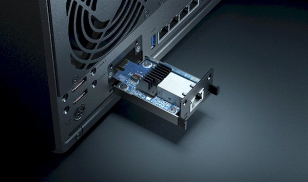 不过都2022年了,这款NAS居然还不支持万兆口,只是提供了4个支持链路聚合的千兆口。好在留了个PCIe扩展槽,可以安装扩充网络卡升级至10GbE 高速网络连线。