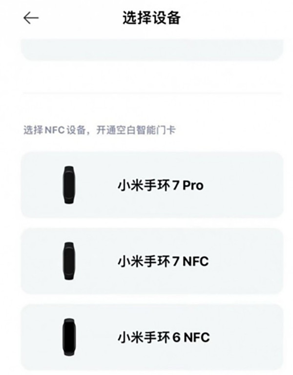上个月就有网友发现,在使用NFC开卡时,意外看到了小米手环7 Pro的身影,除此之外还列出了小米手环7 NFC、小米手环6 NFC、小米手环5 NFC。