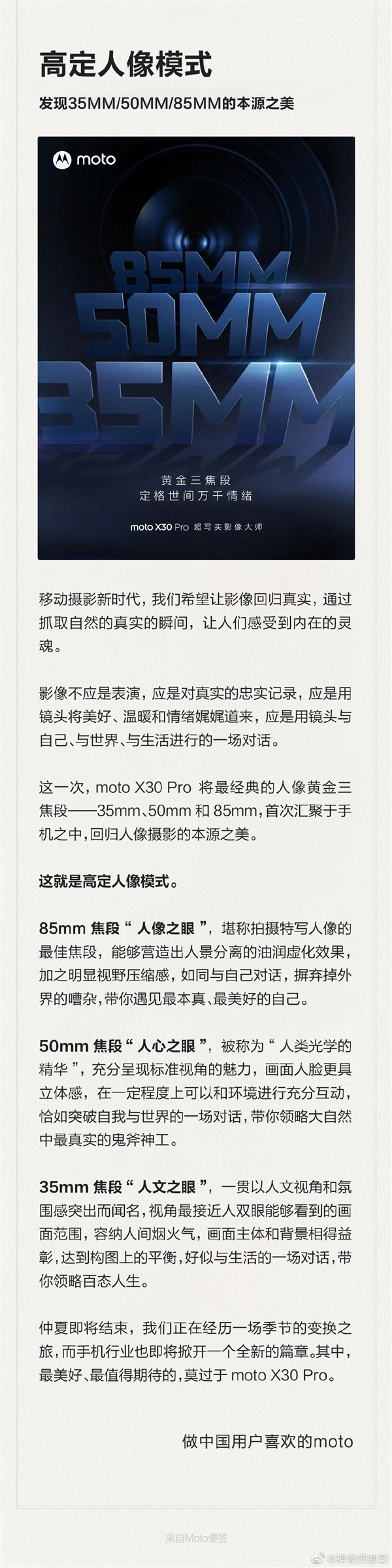 据陈劲介绍,这一次,moto X30 Pro将最经典的人像黄金三焦段——35mm、50mm、85mm,首次汇聚于手机之中,回归人像摄影的本源之美。
