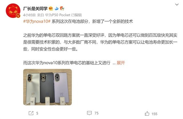 近日,数码博主@厂长是关同学揭秘华为100W快充技术。其表示,华为的单电芯双回路方案此前广受好评,与大多数厂商不同,华为的单电芯方案可以让电池寿命更长,同时安全性也会好一些。