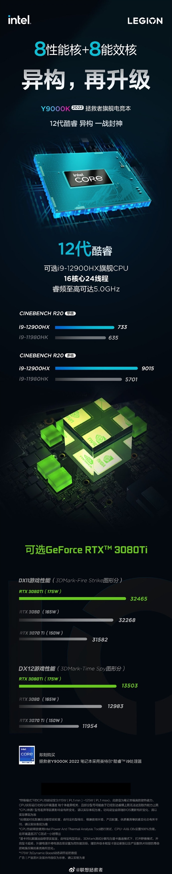 根据官方给出的数据,2022款Y9000K最高将搭载一颗Intel i9-12900HX旗舰级CPU,它采用了8P+8E 16核心24线程,三级缓存30MB,P核频率达3.6-5.0GHz,E核频率也有1.7-3.6GHz,集成核显32单元,频率1.55GHz。