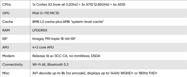 Cortex-X2 大核的频率由天玑 9000 的 3.05GHz 提升到了 3.2GHz,还有三个 Cortex-A710 内核和四个 Cortex-A510 内核,并配备 Arm Mali-G710 MC10 图形处理器。