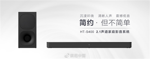 今年1月,索尼在海外发布了HT-S400回音壁音响,等待近半年后,今日,这款音响今日正式在国内发布,官方称“新一代2.1声道家庭影音系统HT-S400”,售价1990元。
