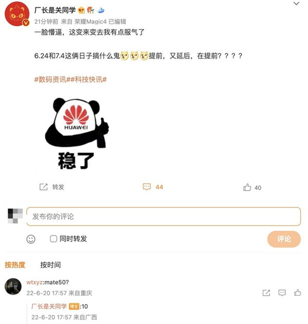 今天爆料博主@厂长是关同学 在微博表示nova10系列或将在此前延期发布的情况下再次提前发布。该博主称“6.24和7.4这俩日子搞什么鬼,提前,又延后,在提前????”结合其此前发布的相关信息与评论区留言,可以猜到其指的是华为的nova10系列机型。