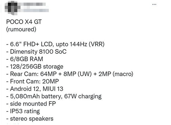 新机名为小米POCO X4 GT,其采用6.6英寸FHD+ LCD全面屏,刷新率最高为144Hz,而这也是目前小米旗下首款天玑8100旗舰处理器。主摄为后置6400万主摄,模组中还有800万超广角和200万微距摄像头,前置2000万像素,电池为5080毫安,支持67W快充。