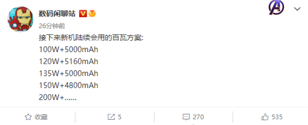 今日,数码博主@数码闲聊站 曝光了接下来安卓新机陆续会用的百瓦方案,具体包括:100W+5000mAh电池、120W+5160mAh电池、135W+5000mAh电池、150W+4800mAh电池,最高一款机型支持200W快充。