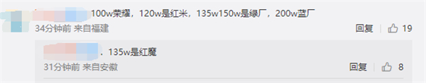 至于分别对应哪些手机厂商的新机,在评论区有网友讨论,100W是荣耀,120w是Redmi,135W是红魔,150W为OPPO,200W则是vivo。