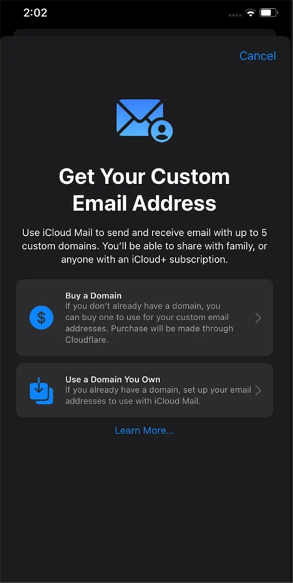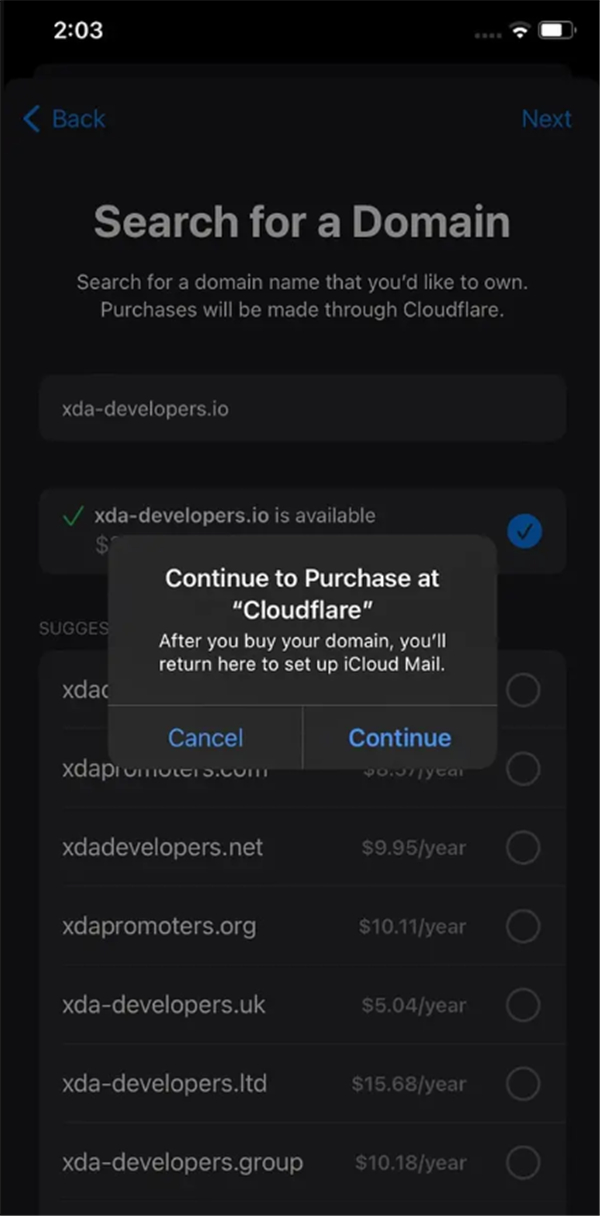 订阅该服务的人可以将他们的一个域链接到 iCloud 邮件并创建/使用自定义电子邮件地址。 Apple 在 iOS 16 上的 Mail 中内置了直接搜索域并通过 Cloudflare 购买它们的能力。
