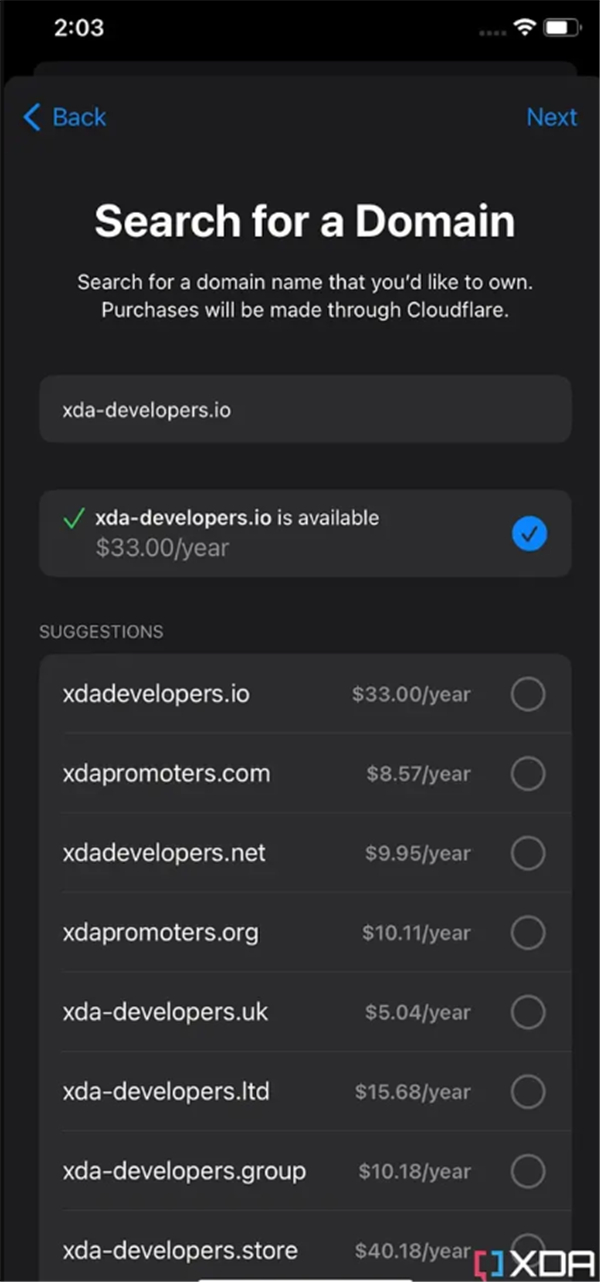 iOS 16 beta 1 已经有了这个功能的用户界面,可以搜索域名就好了。选择所需的域名之后,您将被重定向到 Cloudflare 以完成购买。不过,考虑到它是开发人员 beta 1,不要指望一切都能按预期工作