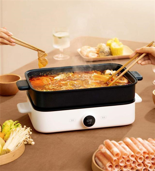 此外,这款料理锅采用智慧旋钮,可调节烹饪时间、火力;同时内置温度传感器,温度过热自动进入保护状态,避免干烧发生意外状况。