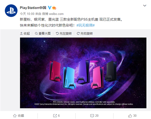 今天上午,@PlayStation中国 官微宣布,国行PS5三色主机盖正式发售,售价399元。