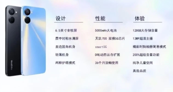 真我V20采用6.5英寸LCD高清护眼屏,分辨率1600×720,该机背部有着不错的颜值,提供墨云黑和星辰蓝两种配色。新机采用了直角边框的设计,配合上竖直排列的双摄,整体有着不错的观感。 在影像方面,该机搭载了500万像素前摄,背部为由1300万像素主摄组成的后置双摄模组,能够满足基本的拍照需求。