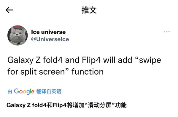 据外媒6月13日报道,日前,根据多次预测成功的爆料者@Ice Universe的说法,三星 Galaxy Z Flip 4和Galaxy Z Fold 4将添加“滑动分屏”功能。目前,现款Galaxy Z Flip 3与Galaxy Z Fold 3,使用者必须打开任务切换器视图,点击应用程序图标,然后选择多窗口作为选项才能进行分屏操作。