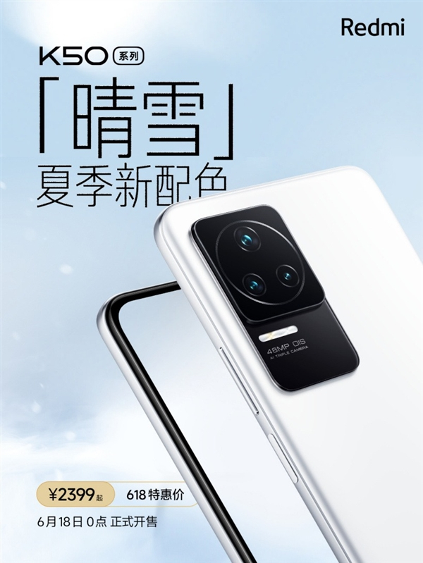 K50晴雪配色,有8+256GB,12+256GB,12+512GB三个存储版本,均在618当天开售;