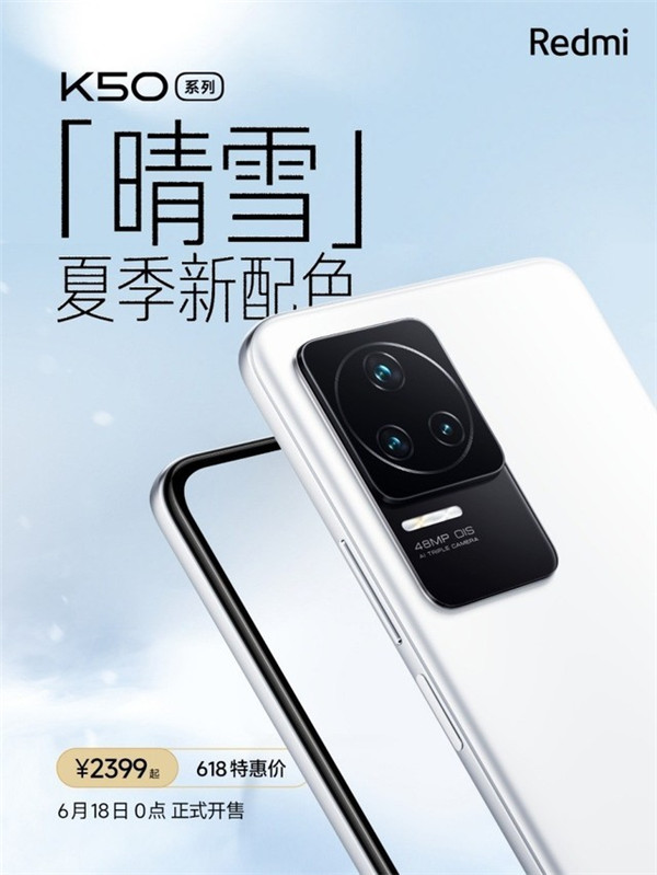 Redmi在发布会上首次公布了K50的纯白配色,标准版和Pro版都有对应的白色版本,将于本周六也就是618当天首发。