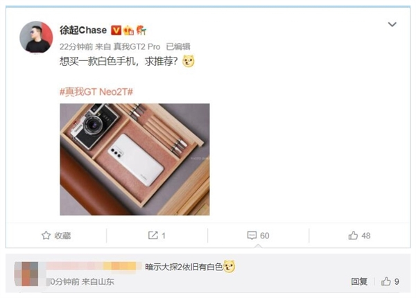 今天,realme副总裁徐起发微博”求推荐白色手机“,网友猜测徐起这是暗示realme GT2大师探索版将会有白色版本。