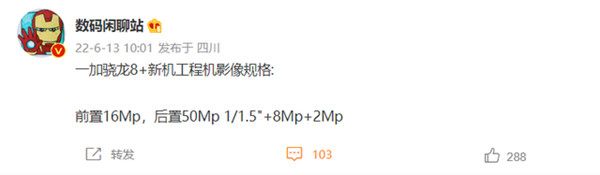 今日,数码博主 @数码闲聊站 爆料称,一加搭载骁龙 8 + 的新机将配备前置 16MP 镜头,后置 50MP 1/1.5" 主摄 + 8MP + 2MP 镜头,听起来后置镜头规格和 OPPO Reno8 Pro 有点像。