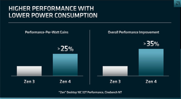 AMD 表示,Zen 4 有望在今年晚些时候为全球首款高性能 5nm x86 CPU 提供动力。Cinebench 测试下,与 Zen 3 相比,Zen 4 预计 IPC 提高 8%-10%,每瓦性能提高 25% 以上,整体性能提高 35%。