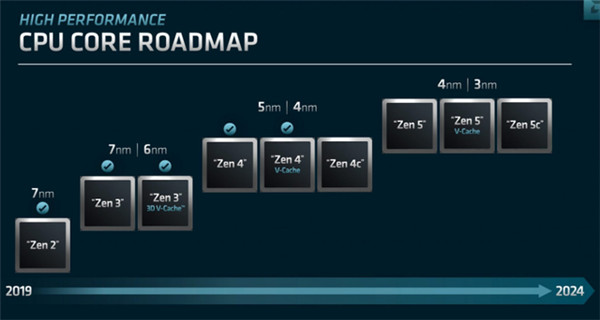 6 月 10 日消息,在今日的 AMD 金融分析师日上,AMD 确认了其未来几年的 CPU 架构计划,确认将在 2024 年前推出 Zen4 和 Zen5 架构。新的 CPU 架构还将配备 V-Cache 技术。