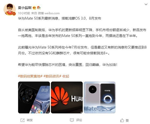 近日,数码博主@夏小辰啊爆料,华为Mate 50系列最新消息,搭载鸿蒙OS 3.0,8月发布。此前曝光华为Mate 50系列将在今年7月份发布,但是最近又有新的消息称又要推迟到8月份。不过依然没有5G和麒麟芯片,很有可能会搭载骁龙8+。