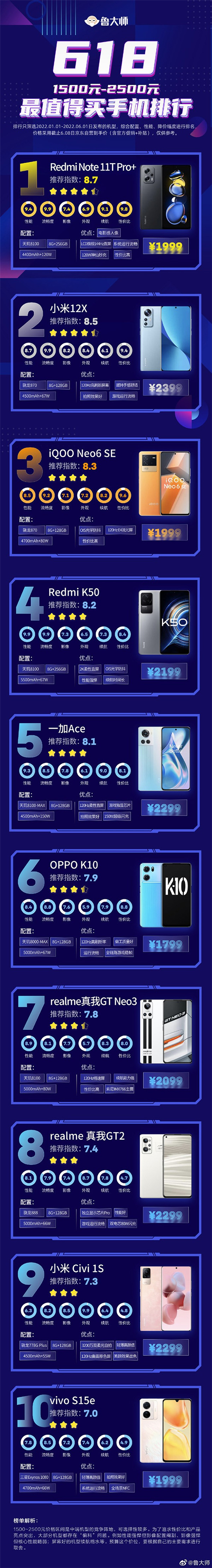 6月9日上午,鲁大师官方微博根据性能/流畅度跑分、影像、性价比等方面评选出了1500元-2500元、2500元-3500元、3500元-4500元三个价位段的618推荐手机榜,Redmi和vivo分享三榜冠军。