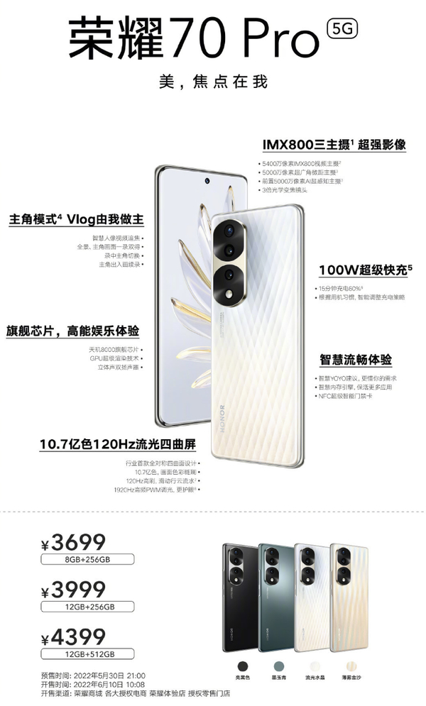 5月30日晚,荣耀推出了数字系列的全新力作——荣耀70系列,该系列一共有荣耀70、荣耀70 Pro、荣耀70 Pro+三款机型。其中荣耀70已正式开售,而荣耀70 Pro将在6月10日10:08正式开售,售价3699元起。