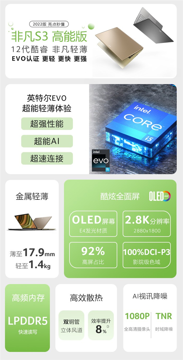 今年3月,宏碁发布了2022款非凡S3轻薄本,在屏幕、外观等方面全面进步得体同时,升级了Intel的12代i5处理器。