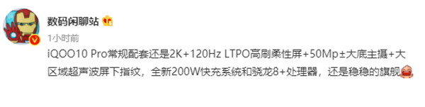 这位数码博主表示,iQOO 10 Pro将支持200W功率的超快充电,这可能是目前智能手机中最高的充电功率了。此前,120W充电即可将手机电池的充满时间缩减到十五分钟左右,而200W充电的表现只会更加亮眼。