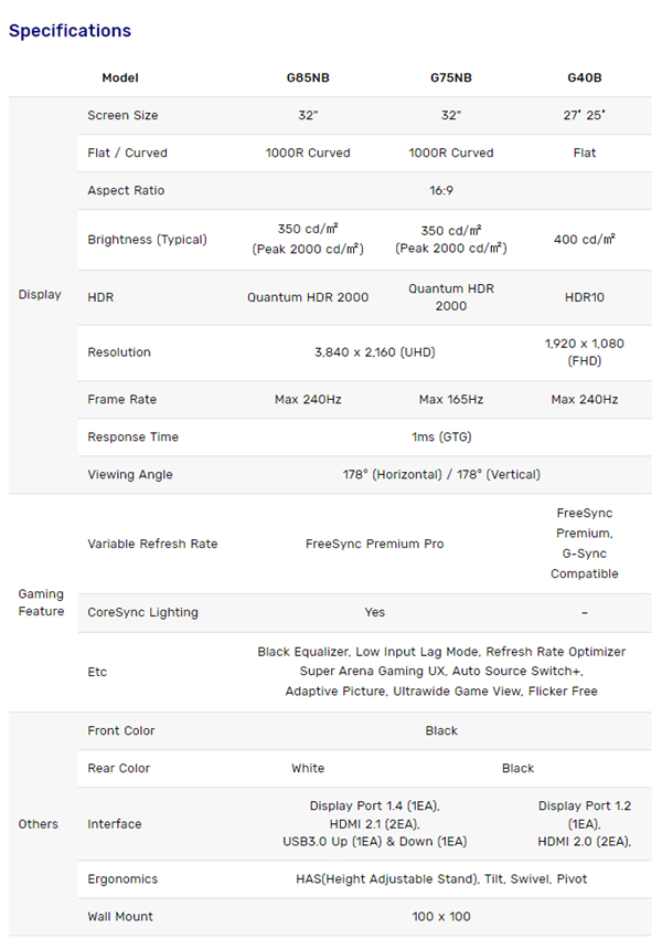 三星刚刚刷新了三条线的 Odyssey 显示器家族新品,并将于本月开始向全球市场推出。其中包括了具有 1000R 曲率的 G85NB(G8)和 G75NB(G7)机型,以及采用平面屏的 GB40B(G4)机型。值得一提的是,G8 和 G4 机型都支持 240Hz 高刷新率、而 G7 机型最高仅支持 165Hz 。