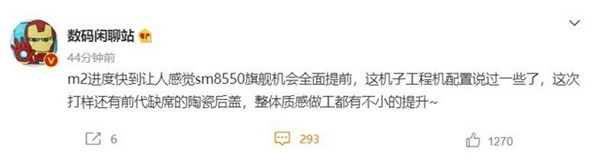 今日,数码博主@数码闲聊站爆料,m2进度快到让人感觉sm8550(骁龙8 Gen2)旗舰机会全面提前,这机子工程机配置说过一些了,这次打样还有前代缺席的陶瓷后盖,整体质感做工都有不小的提升。