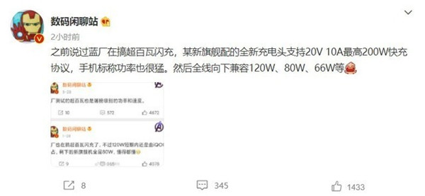 今日,数码博主@数码闲聊站爆料,之前说过vivo在搞超百瓦闪充,某新旗舰配的全新充电头支持 20V / 10A,最高 200W 快充协议,手机标称功率也很猛。然后全线向下兼容120W、80W、66W等。