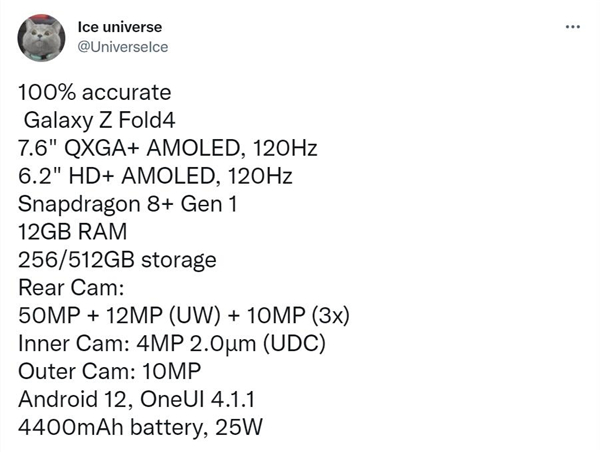 此外,三星Galaxy Z Fold4还有两颗摄像头,一颗位于外屏,像素数量为1000万,一颗位于内屏,像素数量为400万,这颗摄像头藏于屏幕下方。其它规格还有4400mAh电池、25W有线快充、Android 12操作系统等等。