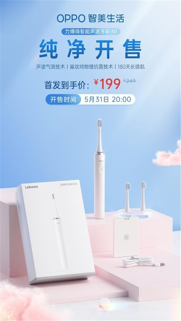 5月31日20点,OPPO智美生活力博得智能声波牙刷N1正式上市,官方定价为249元,首发到手价199元。