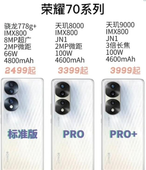 其次,荣耀70标准版将搭载骁龙778G Plus,荣耀70 Pro则会搭载天玑8000,荣耀70 Pro+搭载的是天玑9000。