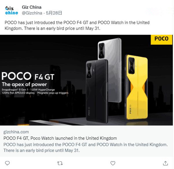 5 月 30 日消息,据 GizChina 报道,今年 4 月份,POCO 在全球市场推出了 POCO F4 GT 手机,但当时将英国市场排除在外。现在,这款 POCO F4 GT 手机登陆英国市场,早鸟价 499 英镑(约 4226.53 元人民币),客户可以在 5 月 30 日之前以特价购买该手机。POCO F4 GT 手机拥有 12GB 内存和 256GB 存储。5 月 30 日之后,这款手机的正常价格将恢复到 699 英镑(约 5920.53 元人民币)。