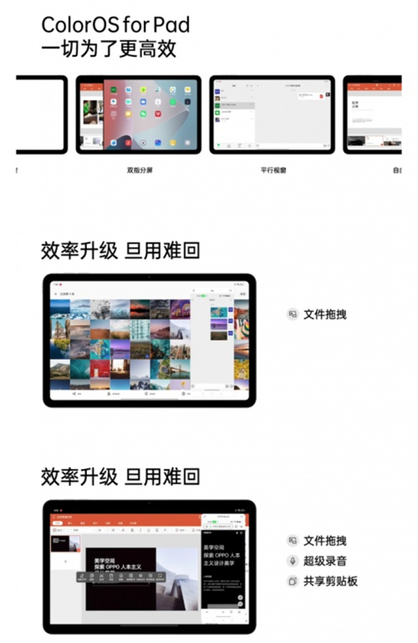 作为实力派,OPPO Pad Air在配置方面同样可圈可点。ColorOS for Pad系统延续了上一代的双指分屏、四指浮窗、平行视窗等智慧交互功能,让学习、娱乐更方便。如,高年级学生在学习时,可以启用分屏功能,一边上网课,一边记笔记。成年人娱乐时,可以一边刷视频,一边微信聊天。当后台同时处理聊天、办公、学习等任务时,OPPO Pad Air能以低功耗运行且十分流畅,连续使用两个小时也不在话下。