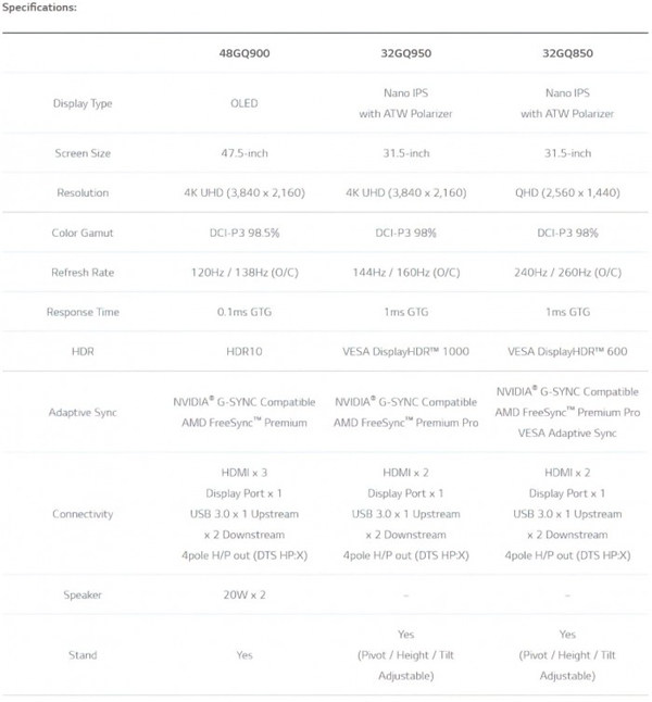 在 Nano IPS 显示技术的加持下,两款 32 英寸机型具有 1-ms 的灰阶响应(GtG)时间。而采用 48 英寸 OLED 面板的 48GQ900,更是低至 0.1 ms 。