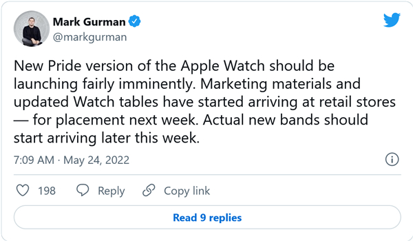 据称,新的以骄傲(Pride)为主题的Apple Watch显示屏和营销材料已经抵达苹果官方旗舰店,这预示着新产品发布在即。为庆祝今年LGBTQ骄傲月推出的新Apple Watch表带预计将相当快地推出。据彭博社的Mark Gurman披露称,新表带应该在本周晚些时候抵达零售店。