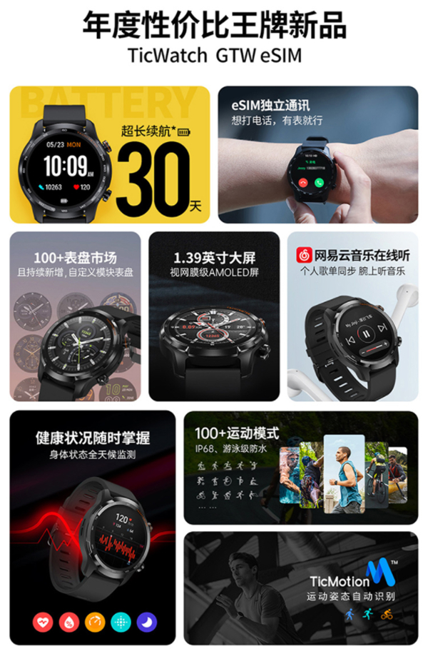 运动方面,TicWatch GTW eSIM支持100+运动模式,包括攀岩、帆船、骑行等,出门问问自主研发的TicMotion Al算法加持,不论走、跑、还是骑,都能自动识别与记录,还支持IP68级游泳级防水。