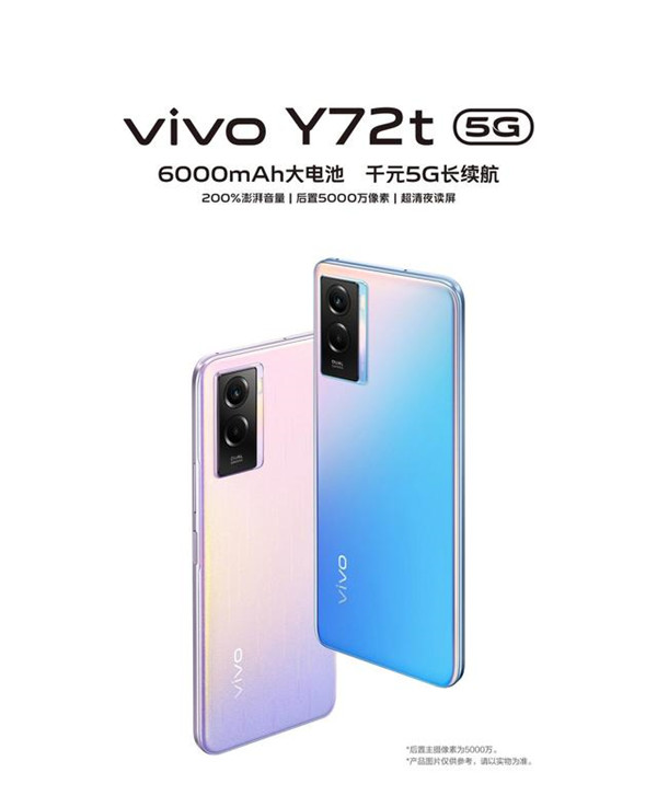 近日,vivo Y72t 新机上架了 vivo 官网,搭载 6000mAh 大电池,主打千元 5G 长续航。