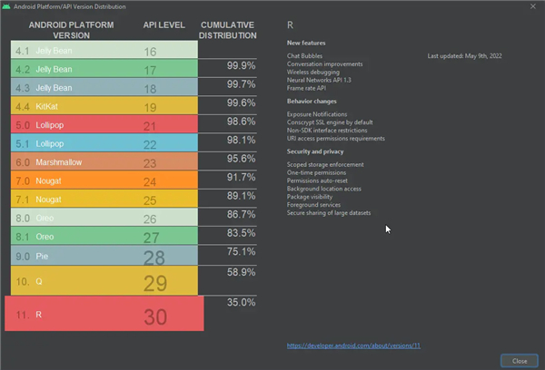 在这个最新的图表中缺乏 Android 12 的统计数据,可能与它对Android开发者的预期目的有关。Android Studio中的图表不是作为你的应用程序应该针对哪些Android API的指南--Play Store通过其最低API要求来处理这个问题--而是旨在帮助开发者决定到底应该支持哪些版本的Android。