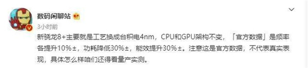 近日,知名数吗博主@数码闲聊站 在微博上曝光了高通骁龙8 Plus更多配置细节:“高通骁龙8 Plus将采用台积电4nm工艺,CPU和GPU的架构并未做出改变。频率提升10%左右,功耗降低30%左右,能效提升30%左右。“不过,他也这些规格还需要官方进一步证实,还是要以官最终发布信息为准。不过,按照目前的发布节奏高通8 Plus的手机产品恐怕赶不上618这波促销了。